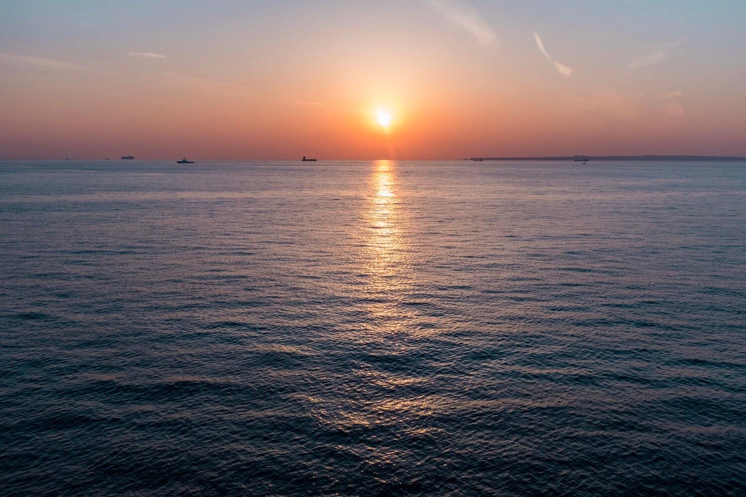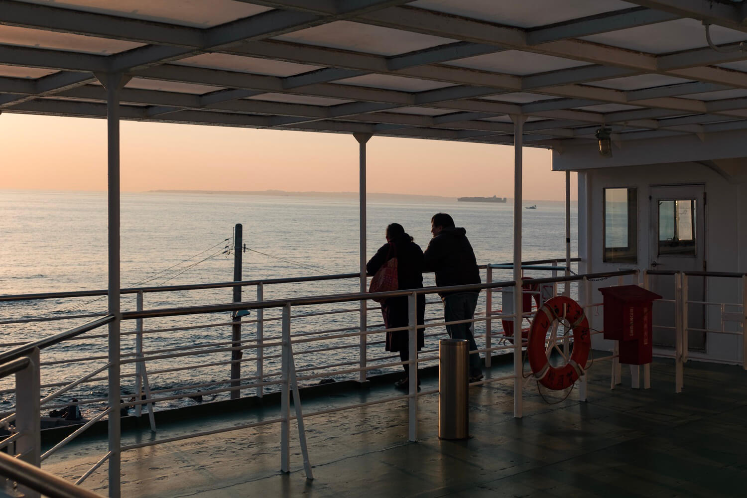 金谷から東京への帰路には東京湾フェリーで。ちょうど時間がよく海上から夕日が沈むのが見えるということでワクワクしながら乗船。海の青と空の青、そこに夕日の赤が混じり合った複雑なグラデーション。心が打たれるような光景がそこには広がっていました。