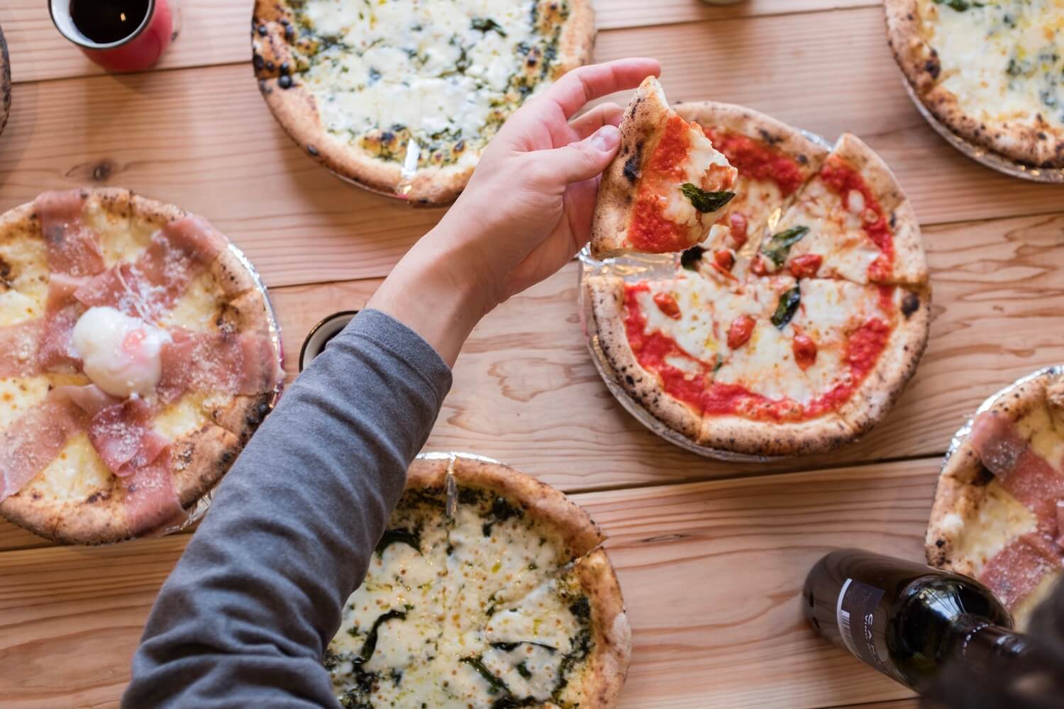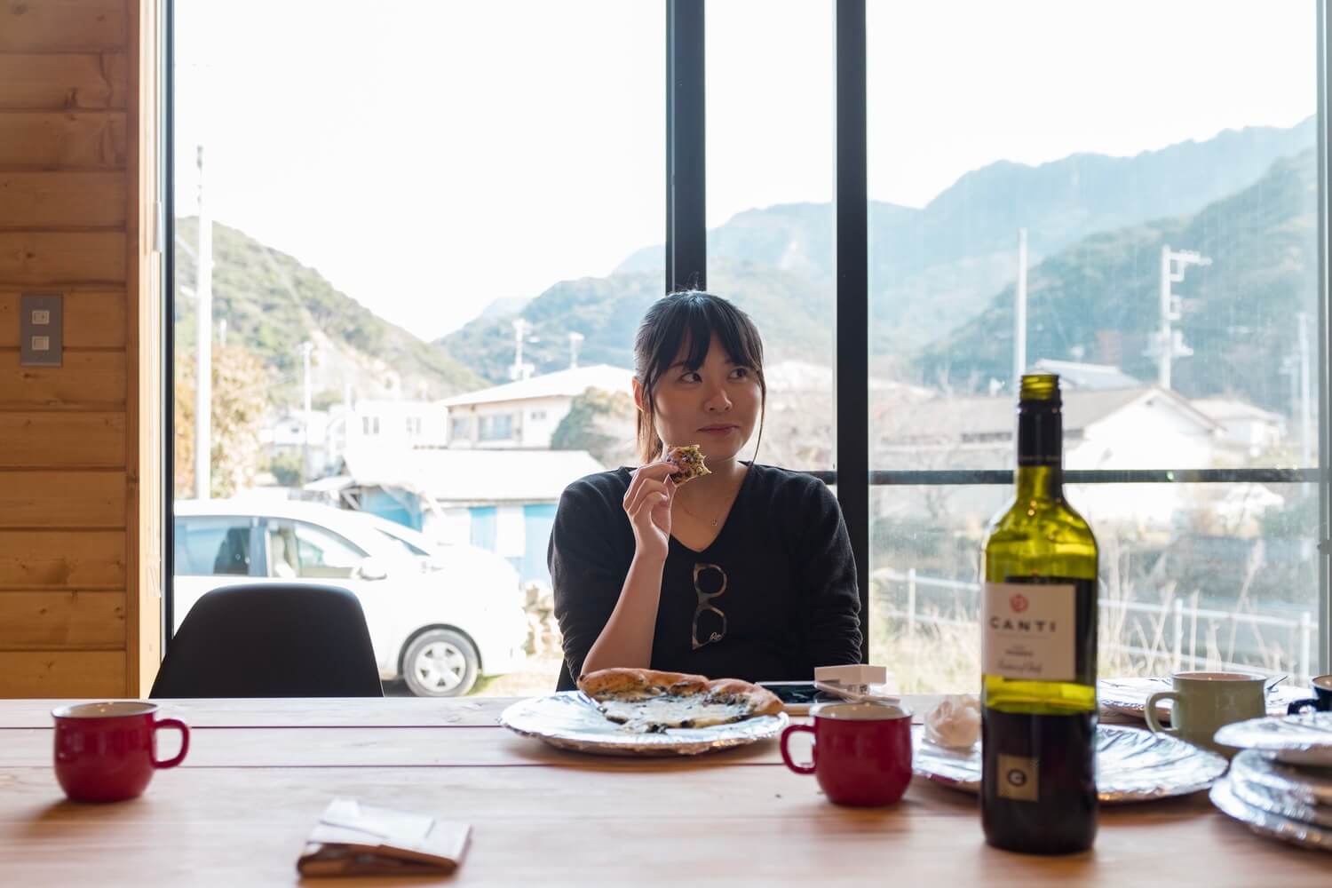 翌朝は朝から各々好きなことをしつつ、お昼は近くのピザ屋でテイクアウト。石窯焼きたてのピザをみんなで囲みました。