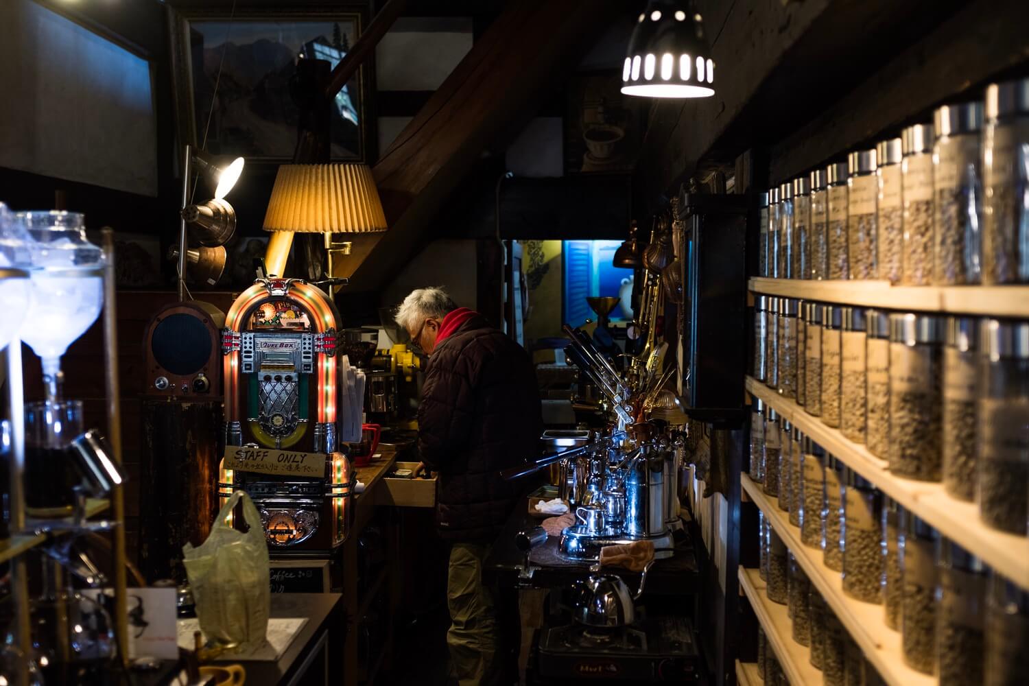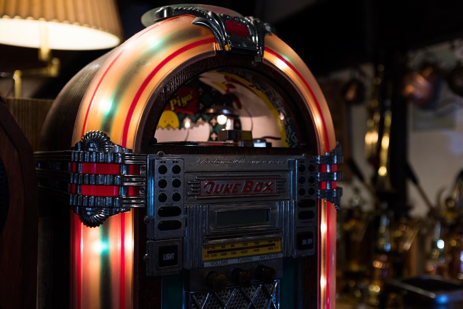 お店に入るとそこはまるで異空間。ヴィンテージのエスプレッソマシーンからライカ、ジュークボックスなど広い店内には男心をくすぐる様々なヴィンテージ品が展示されています。