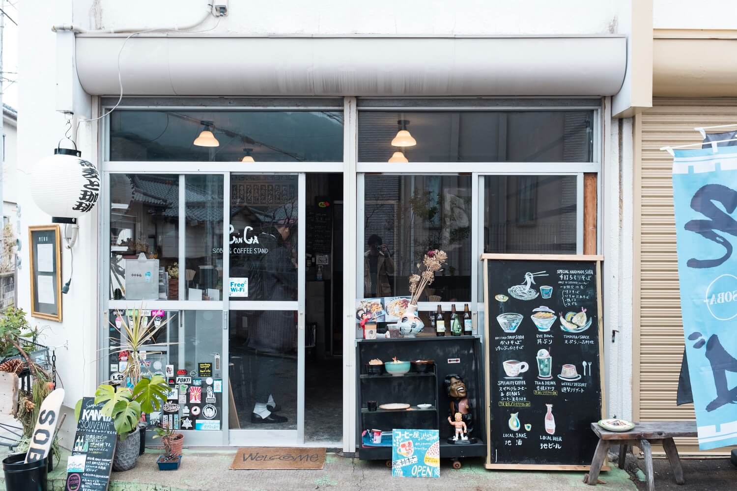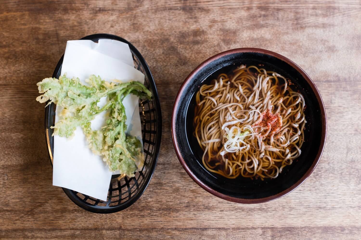 SANGA Soba&Cofee STANDというお店で、その名の通りスタンド形式のオシャレな店内で蕎麦と珈琲、デザートなどが楽しめます。揚げたての春菊天そばをいただきました。