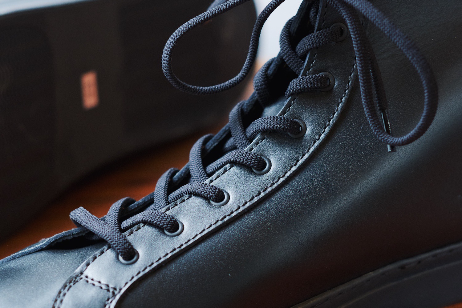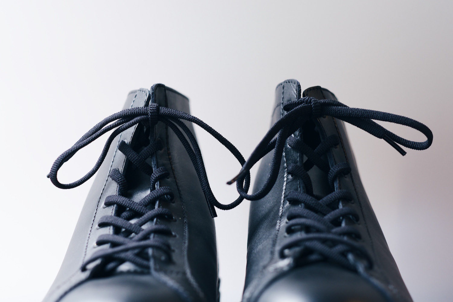 潔いほど無駄を排除したミニマルなデザインは細部にも。シューレースを通すハトメという金属パーツは全てマットブラックにコーティングされています。