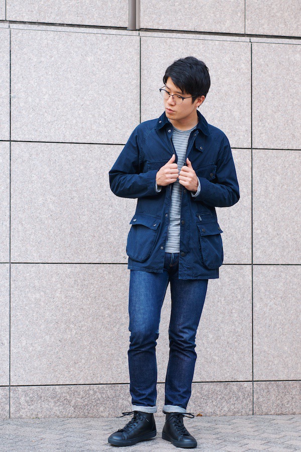 次はWhiteMountaineeringとコラボしたBarbourのジャケットに、ワンウォッシュのデニムパンツを合わせて男っぽくコーディネート。無骨さを出しつつも、全体をブルートーンにして大人っぽくまとめるのがFukulow流。