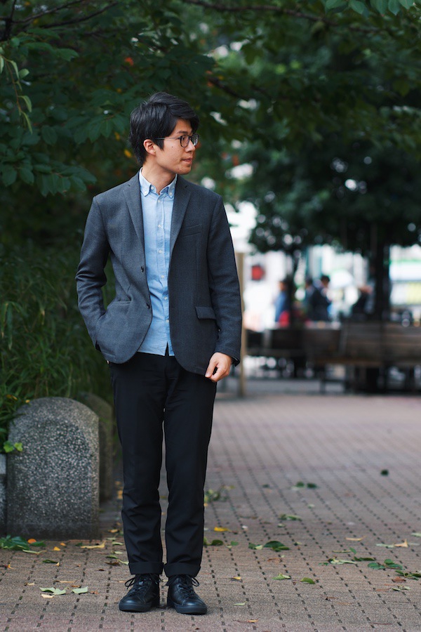 シャツ、ジャケットにスラックスというフォーマル感あるアイテムで固めたコーディネートにYOAKのスニーカーをオン。